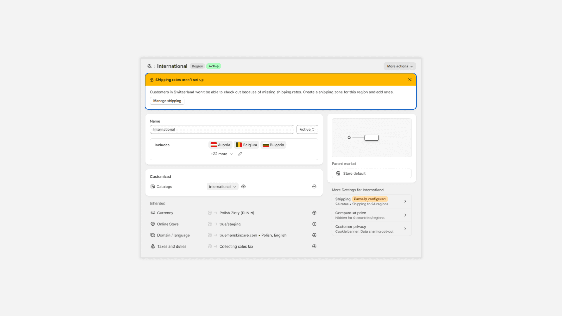Uruchom Shopify Markets Pro: waluty, podatki, cła w checkout, płatności per rynek.