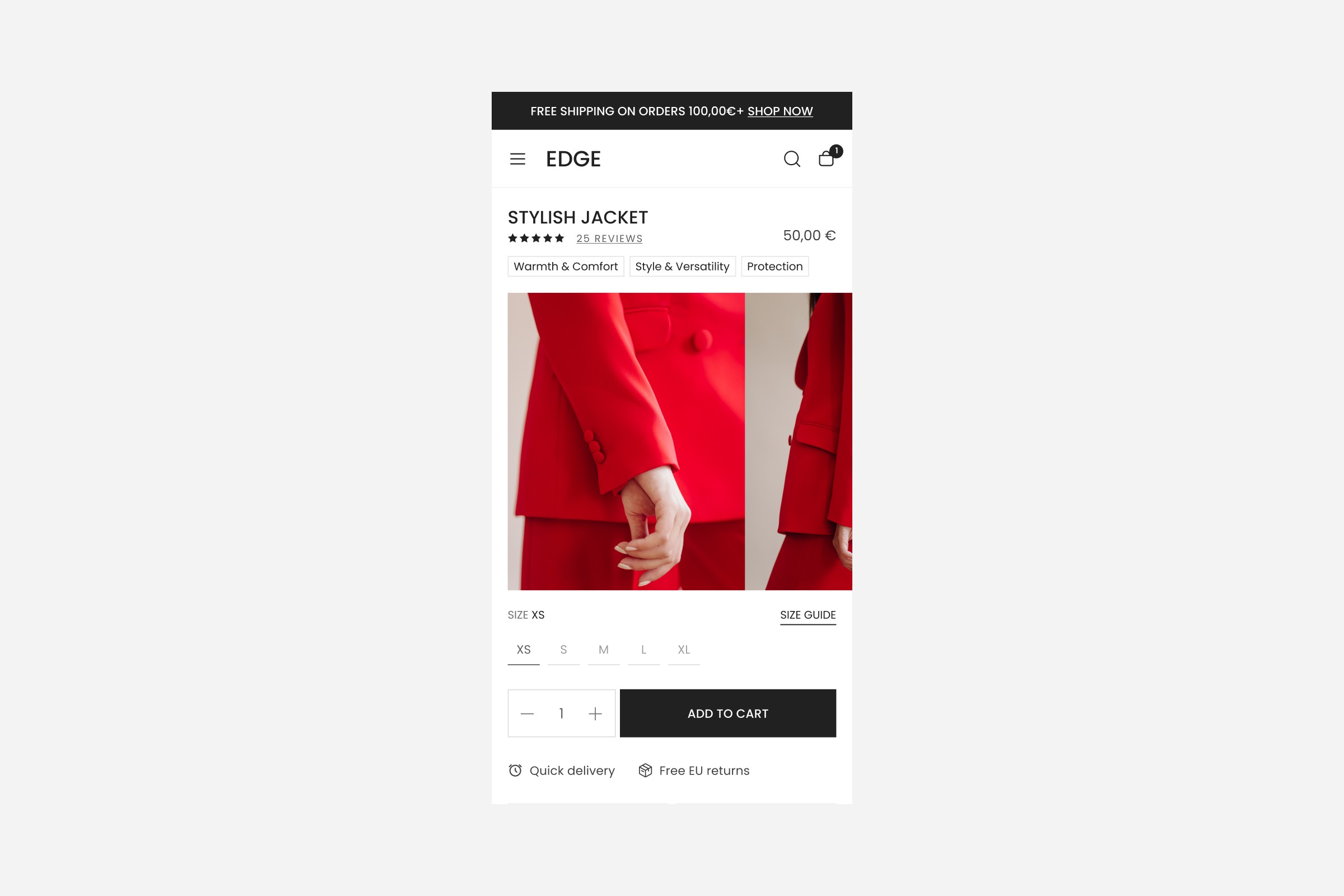 Na dobrej stronie PDP użytkownik od razu rozumie, co zyska po zakupie, ile zapłaci i kiedy produkt do niego dotrze. Tytuł jest konkretny, obok pojawia się cena wraz z ceną za jednostkę (jeśli dotyczy), a przycisk „Dodaj do koszyka” pozostaje widoczny zarówno na desktopie, jak i w mobile. Poniżej, ale wciąż nad zgięciem, widać krótkie korzyści i podstawowe sygnały zaufania: informację o zwrotach i dostawie.