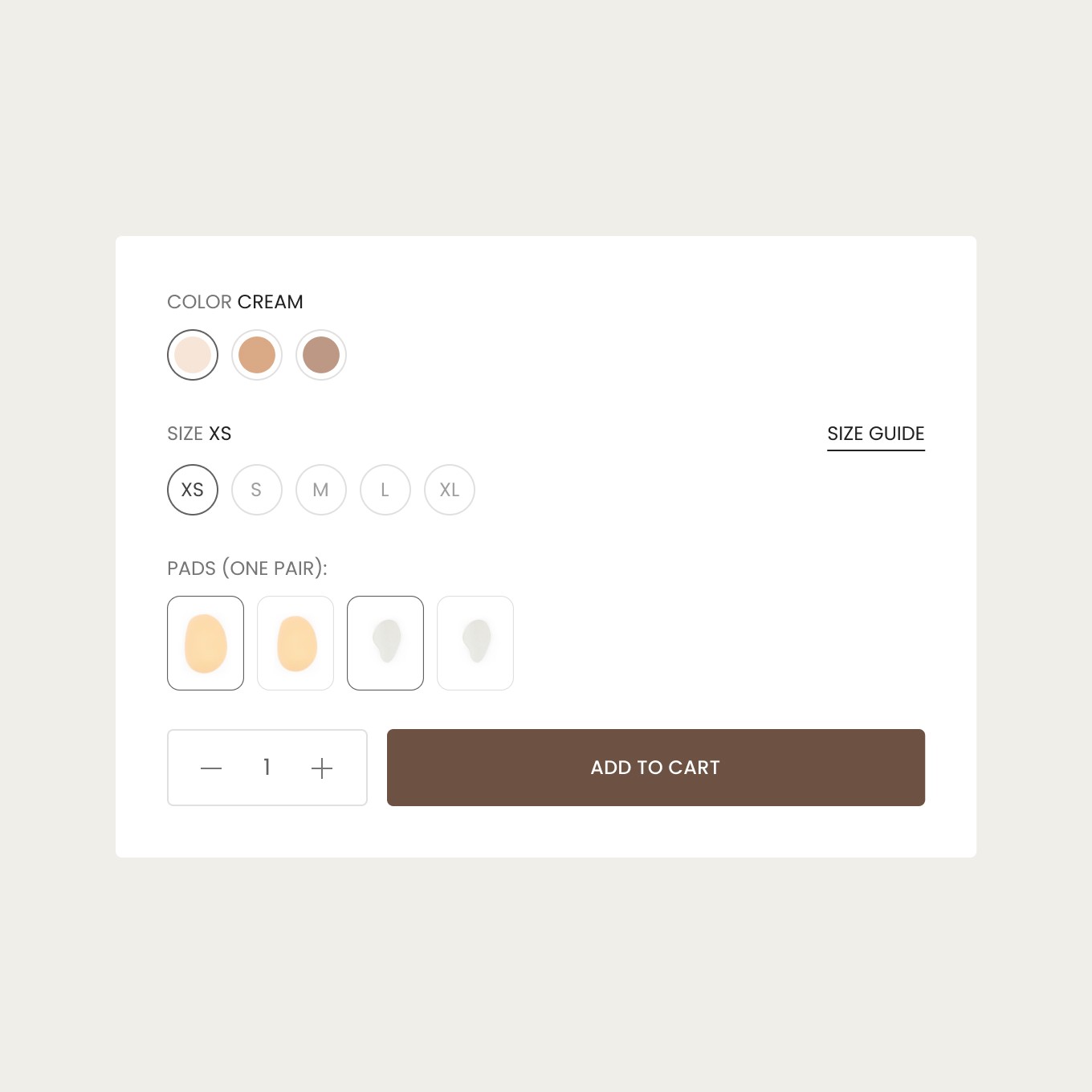 Underhance products rely on complex combinations of sizes, padding levels and shaping options. We built a custom variant selection mechanism that unified these variables into a clear and intuitive configuration flow for customers.